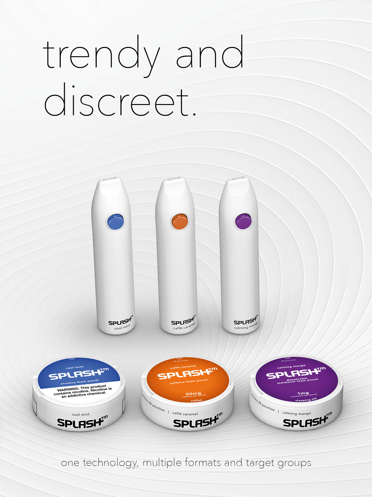 SPLASH looks trendy, feels trendy in the palm of the hand and tastes absolutely trendy. SPLASH comes in a wide range of mood boosters with various active ingredients. but almost the best part is, that SPLASH does not require any batteries, produces no smoke or steam and can be used discreetly anytime, anywhere.