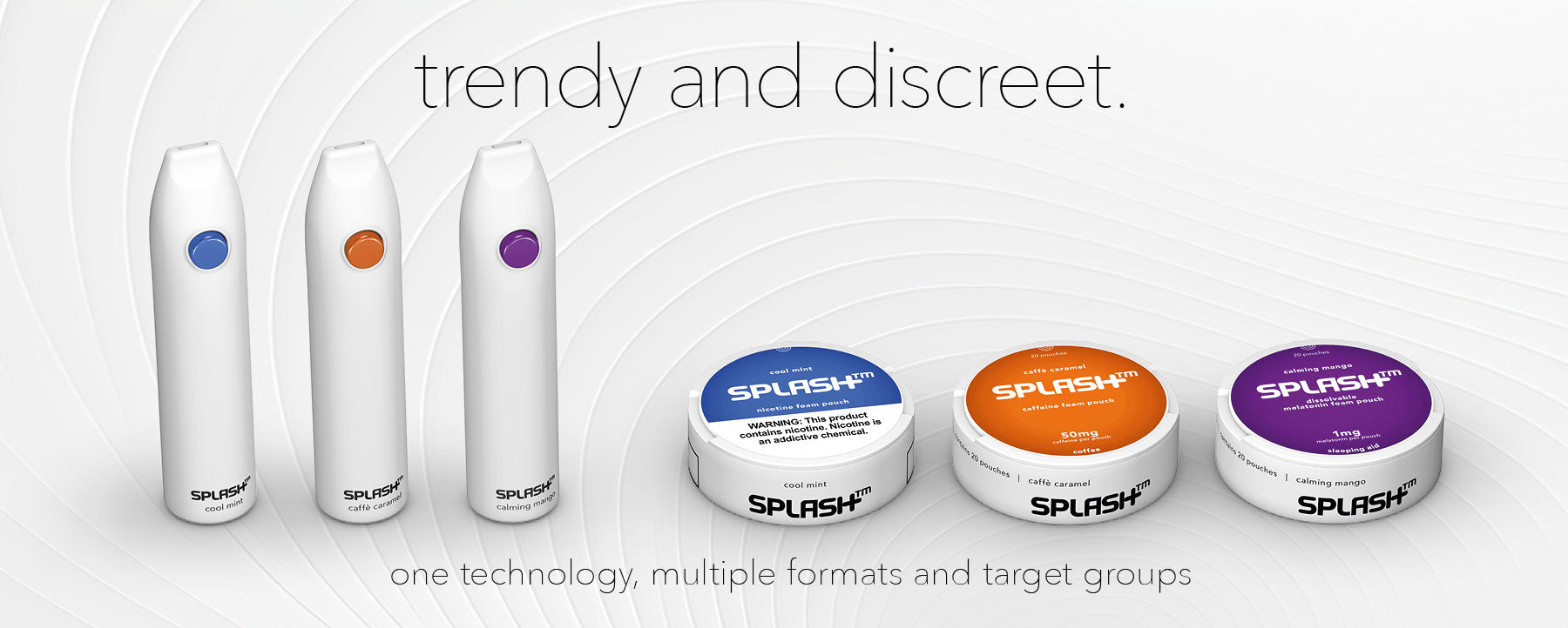 SPLASH looks trendy, feels trendy in the palm of the hand and tastes absolutely trendy. SPLASH comes in a wide range of mood boosters with various active ingredients. but almost the best part is, that SPLASH does not require any batteries, produces no smoke or steam and can be used discreetly anytime, anywhere.